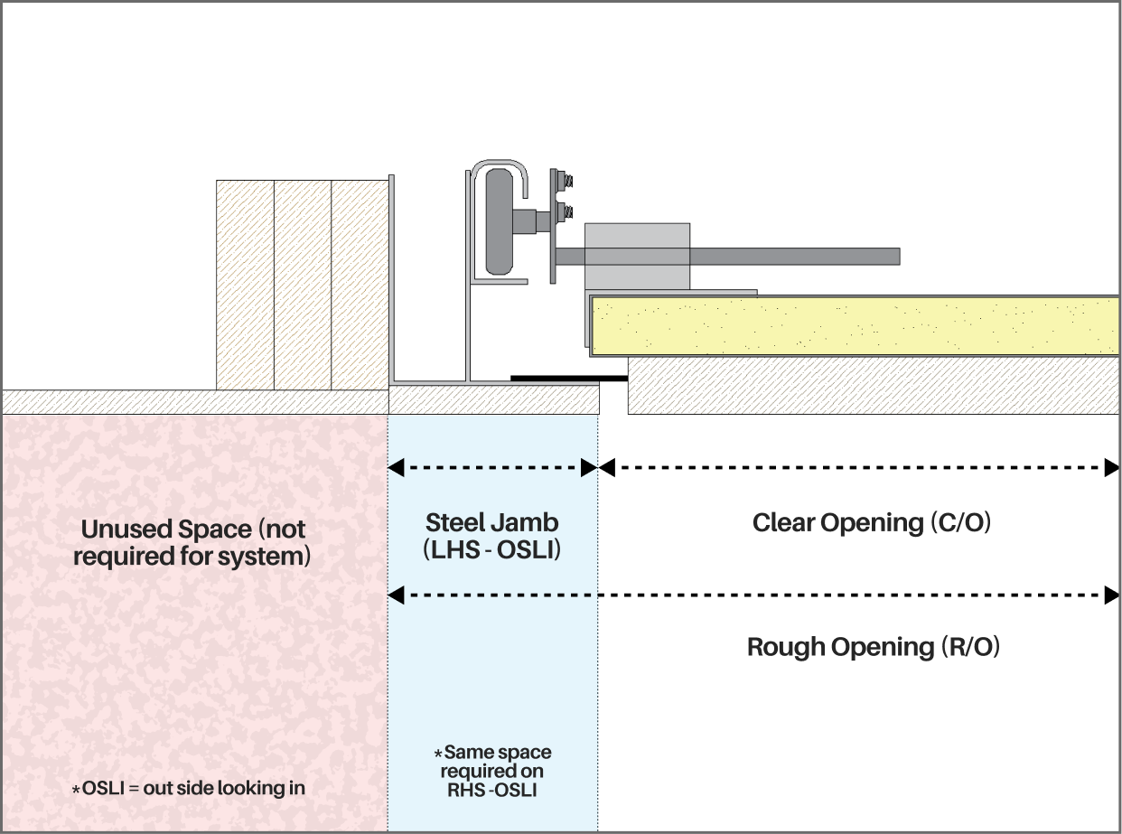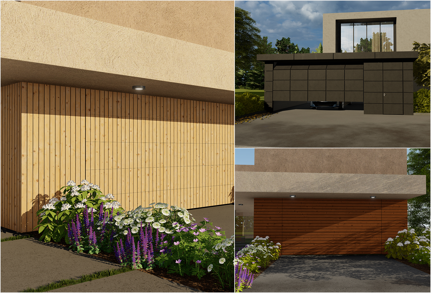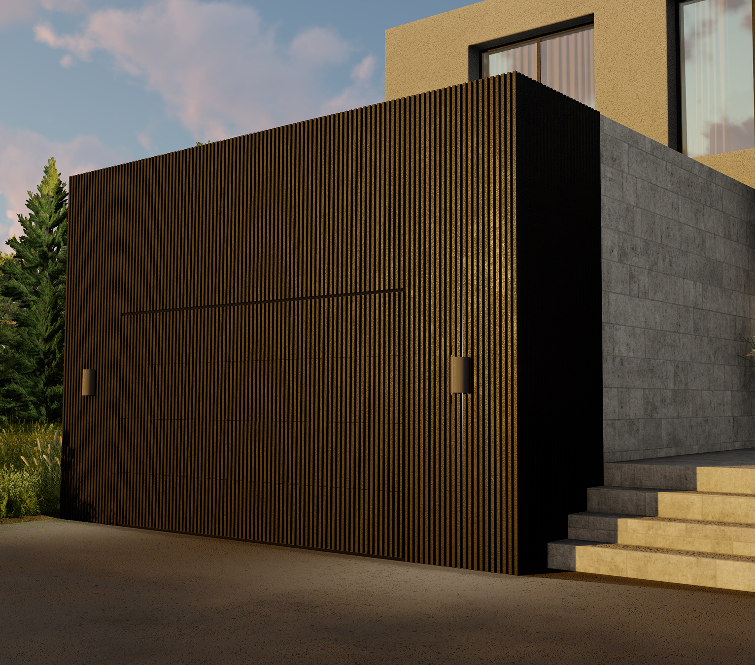 Installed between the structural jambs and beneath the header, the system allows exterior cladding to continue across the door surface — creating a hidden garage door that blends into the surrounding architecture.